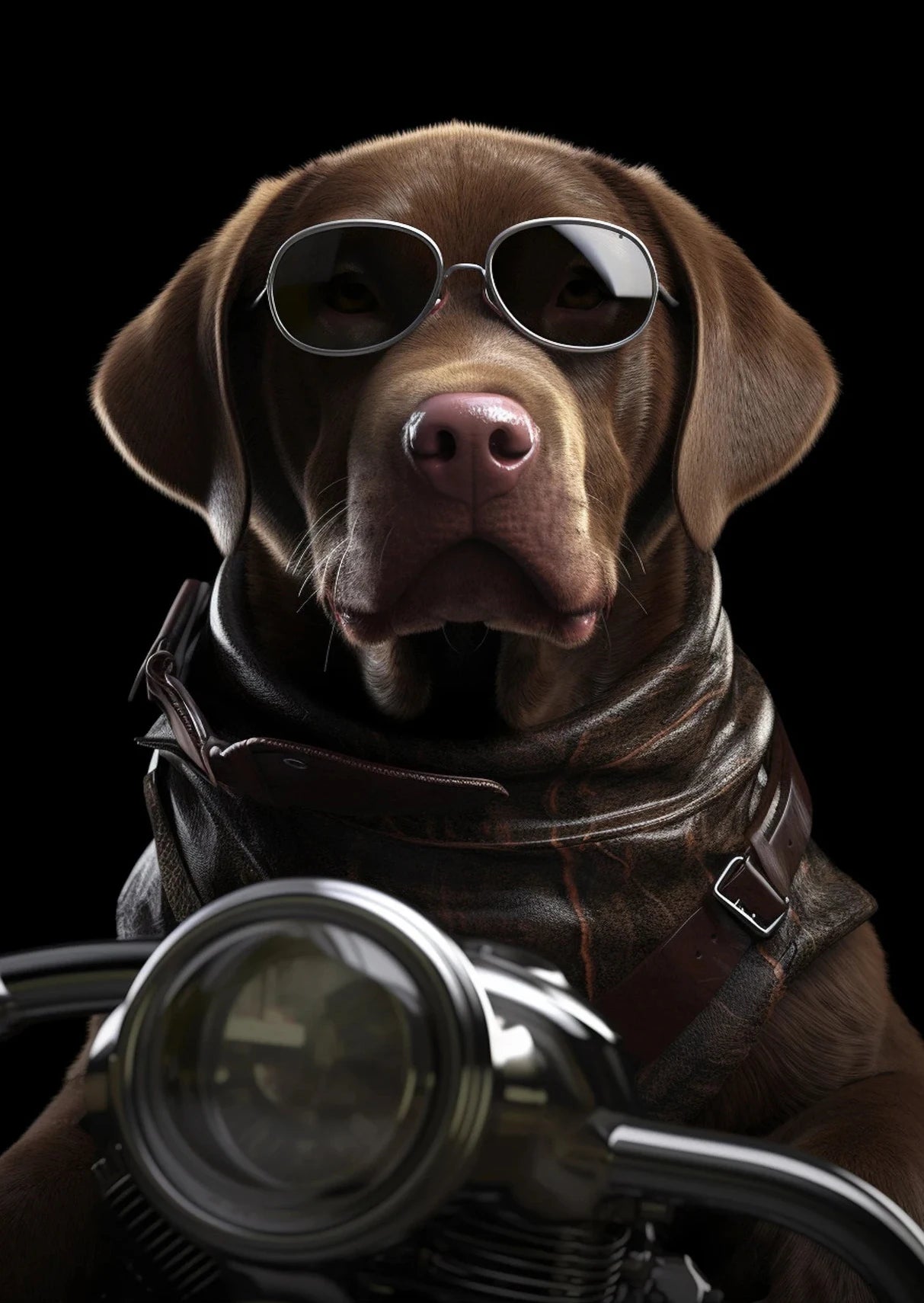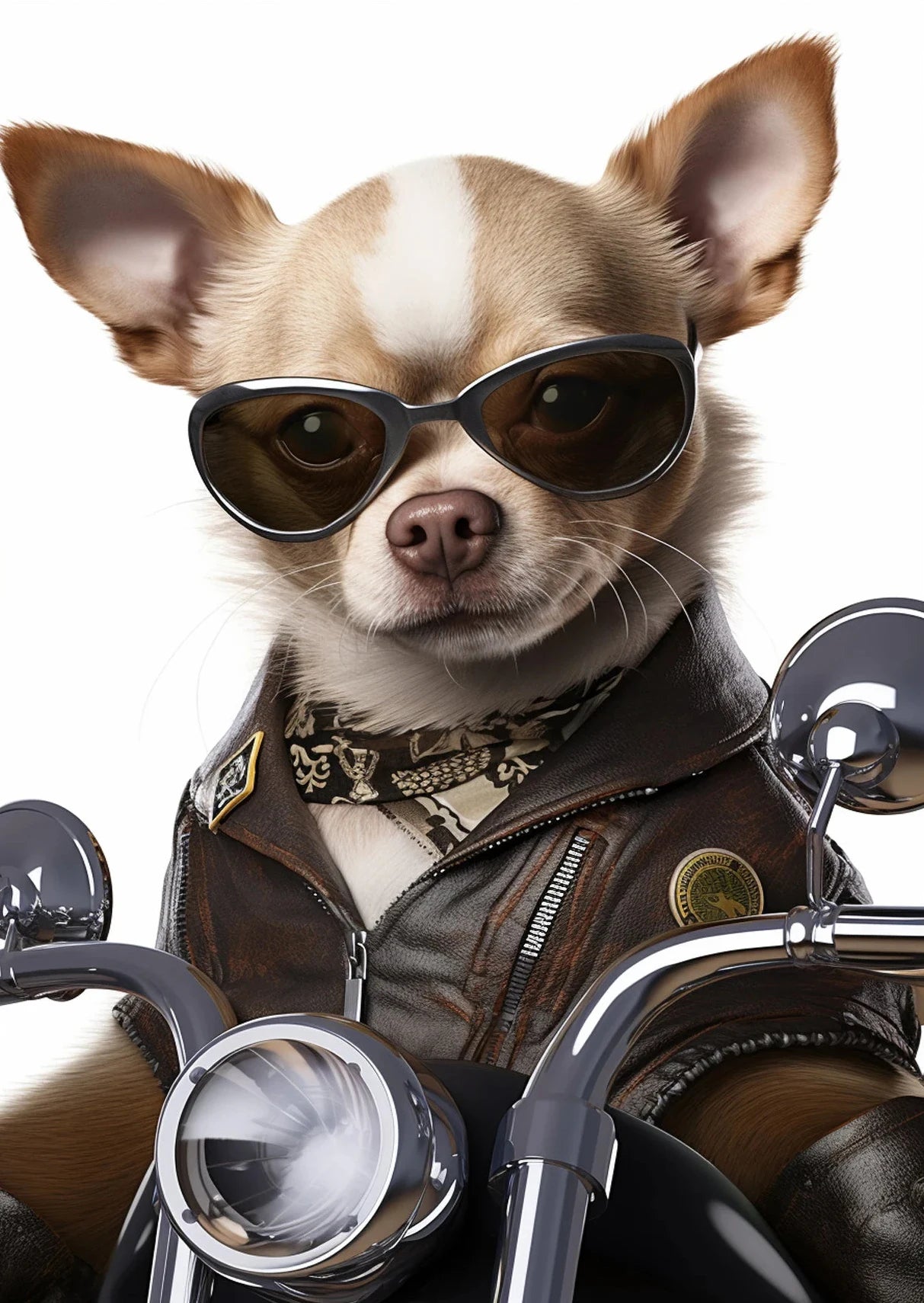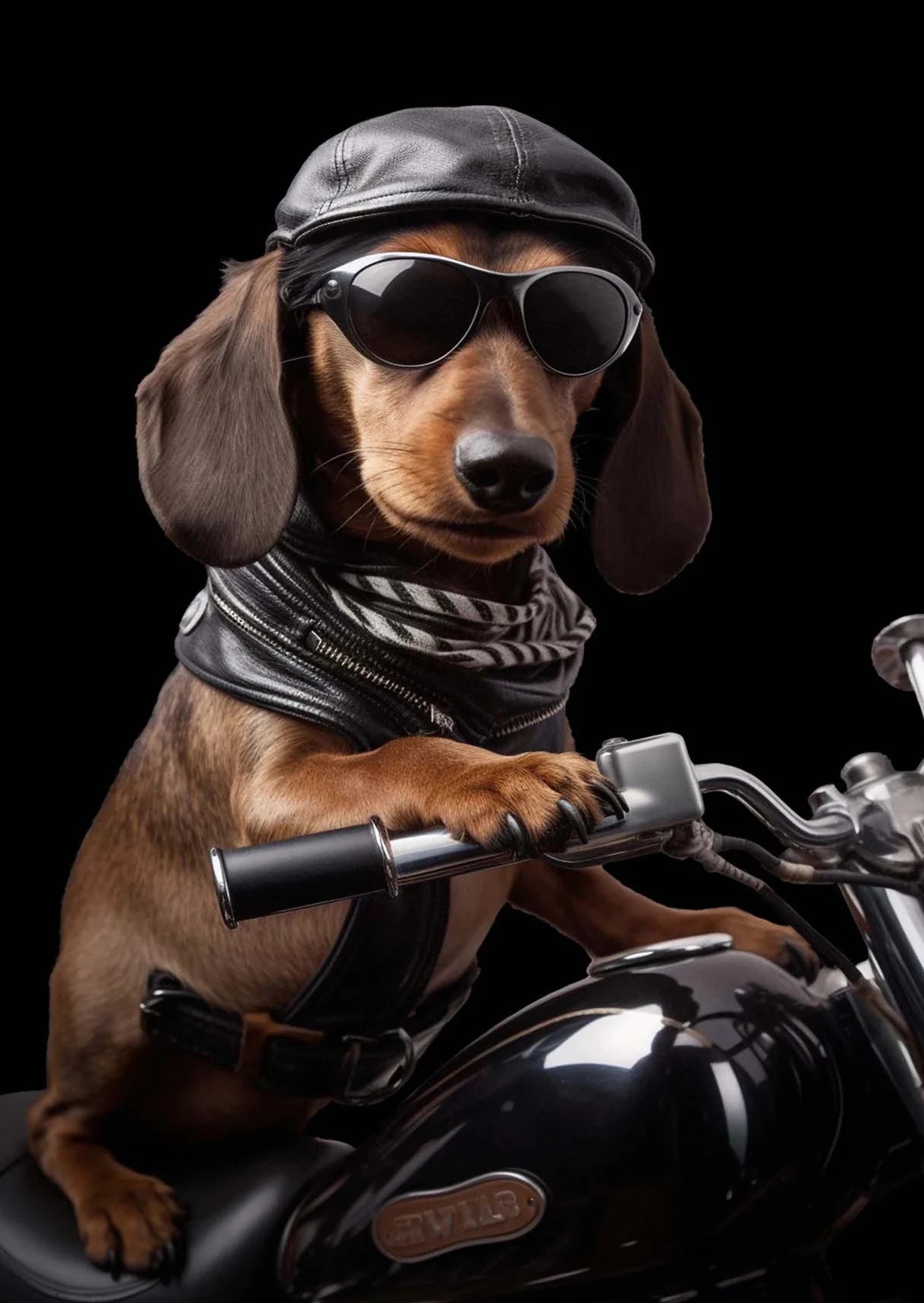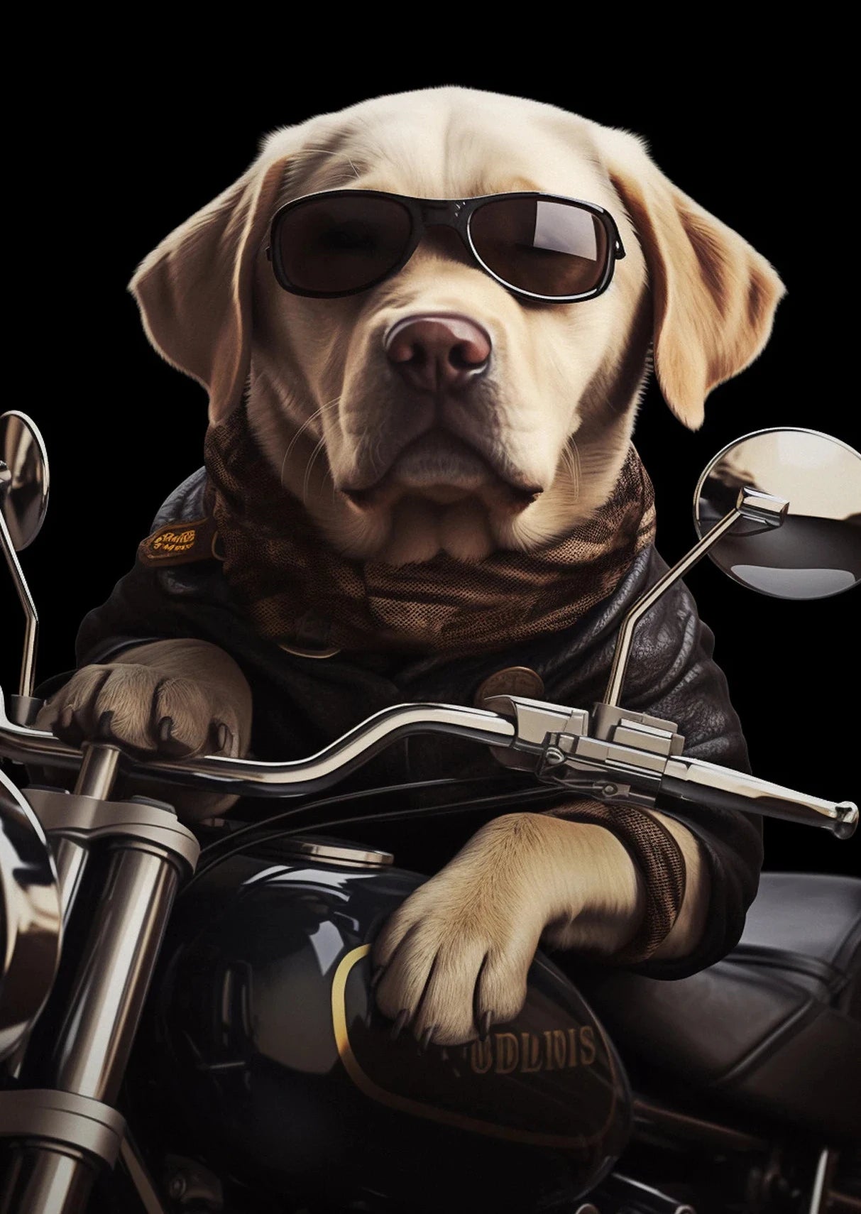 Hilarious artwork of a dog and cat on a motorcycle in cartoon or realistic style