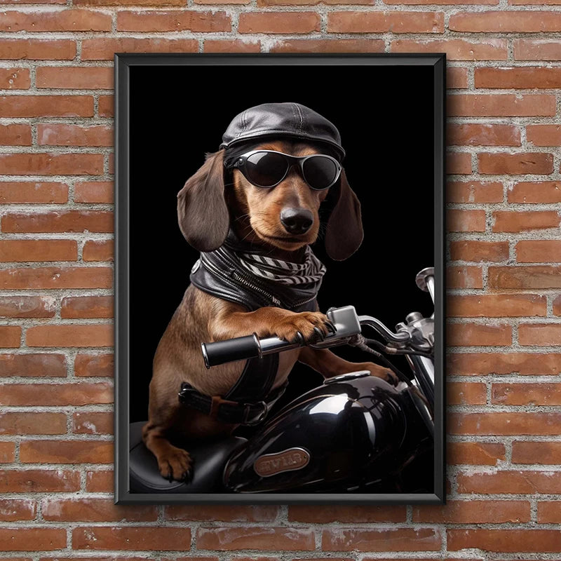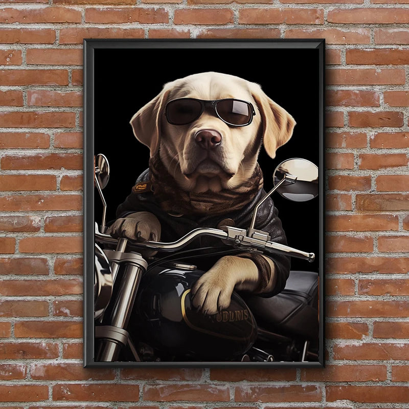 Add personality and laughter to your home—grab this whimsical dog & cat motorcycle canvas print today!