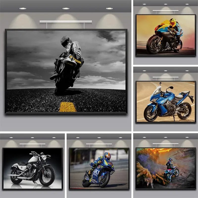 Feel the adrenaline of the track with this Motorcycle Racing Biker Canvas Art Poster. Featuring high-speed sports bike imagery, it's a must-have statement piece for fans of two-wheel power and racing culture.
