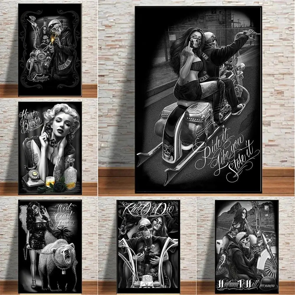 Chicano Culture Knight & Motorcycle Canvas Poster – Black & White Graffiti Tattoo Wall Art for Living Room Decor