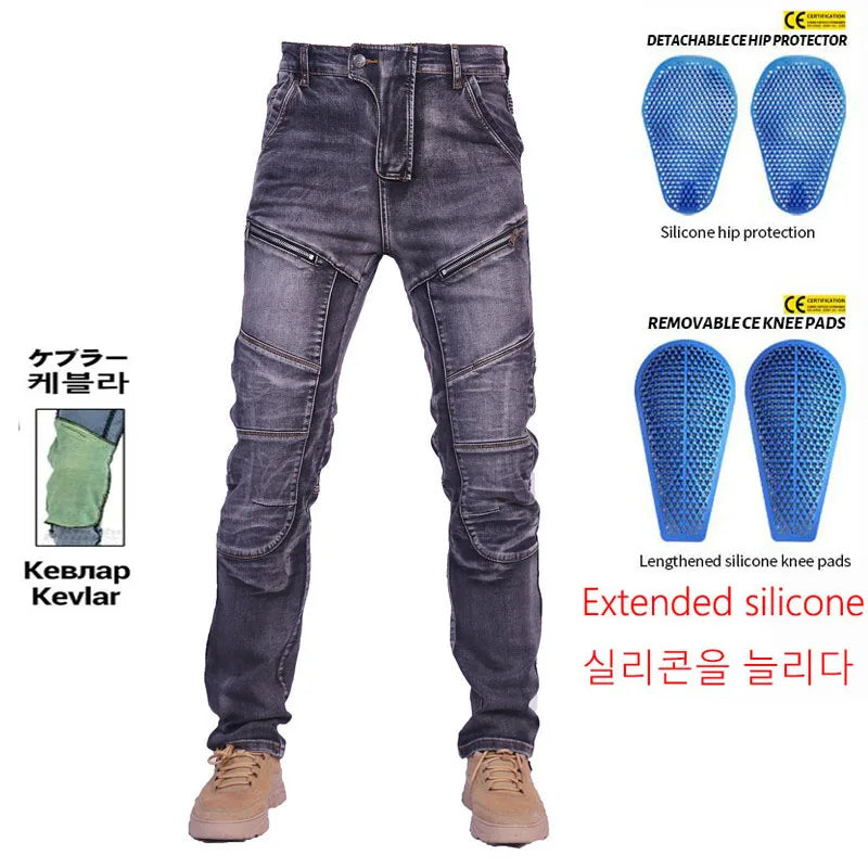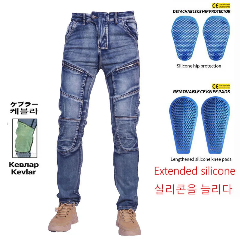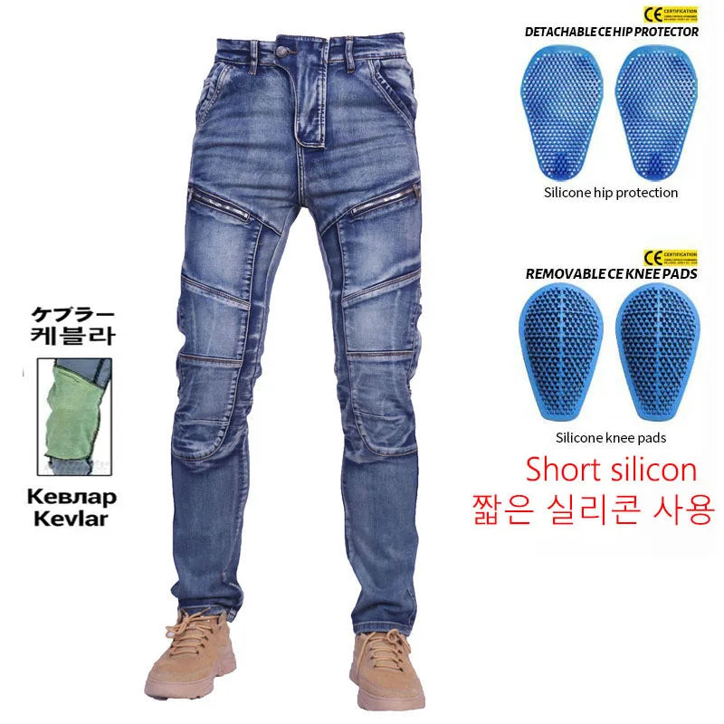 High-quality denim with Aramid Kevlar lining in impact zones for enhanced abrasion resistance and safety.