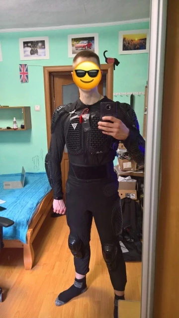 Full CE-approved protective gear at shoulders, elbows, chest, and back (turtle shell design)