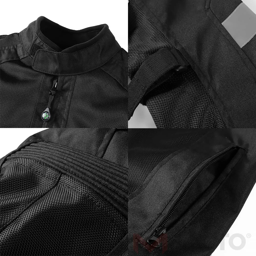 Durable reflective Oxford fabric with mesh ventilation panels and CE protective armor.